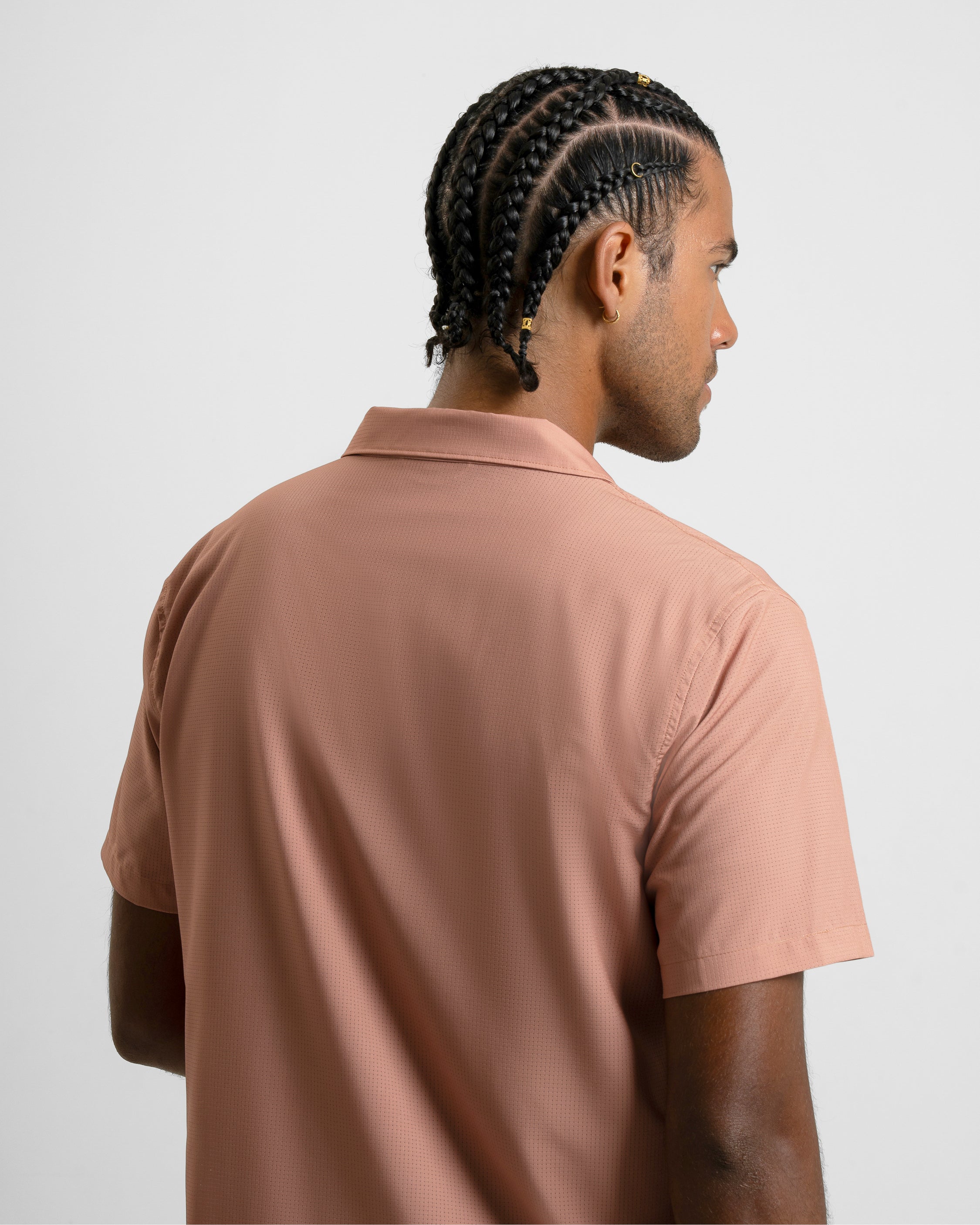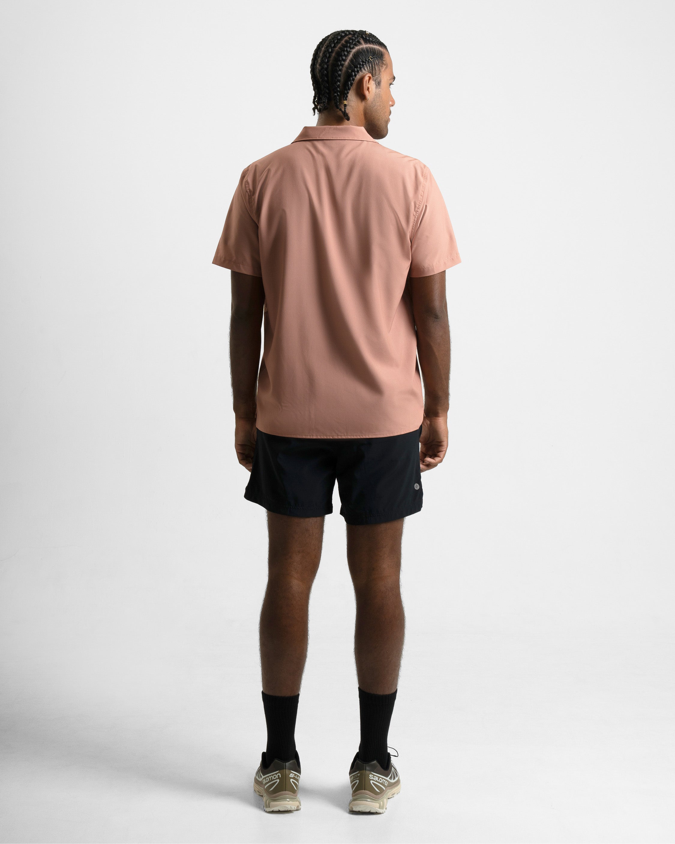 It’s made with our technical fabric blend that dries quickly and breathes well, so you’re not thinking about what you’re wearing, you’re thinking about what you’re doing. The camp collar and straight hem give it a timeless, every‑place feel.